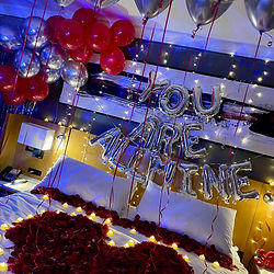 I'll need -3 hours to complete this look! This set up includes 3500 Rose petals, foil heart shaped balloons, Latex balloons, over head balloon Garland, 16-Inch Letter Foil Balloons Spelling Out Phrase of Your Choice; (ex: Happy Birthday; Just because; Will you be my girlfriend?), battery operated candles, Complimentary wine, bottled water, & 2 wine glasses.